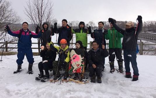 冬の新たな観光資源としての可能性を探るため、中泊町大沢内ため池公園でスノーシュートレッキングを体験する現地検討会を行いました。