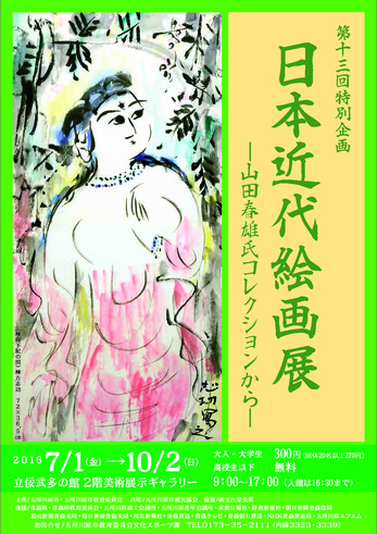 当市出身の山田春雄氏のご厚意により、地域文化の発展を目的として開催してきた特別企画展も今年で13回目となりました。今回は、同氏のコレクションの中から棟方志功を始めとする日本の近代を代表する作家たちの絵画作品を多数展示いたします。本展は豊かな心と創造性に富んだ青少年の健全な育成と地域文化の香りを高めることを願い、開催しました。
