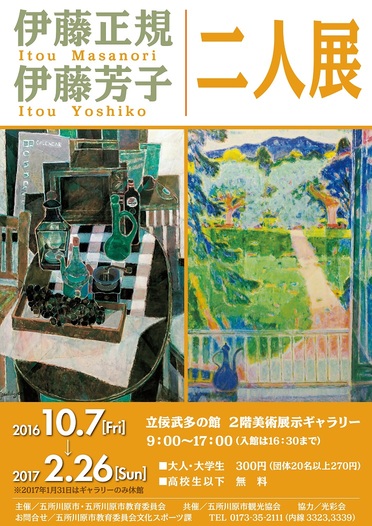 当市出身で五所川原市名誉市民でもある洋画家伊藤正規氏の生誕105年を記念し、伊藤正規氏と同じく洋画家の伊藤正規氏の妻・伊藤芳子氏、両名の作品を合わせて展示する展覧会を開催いたします。