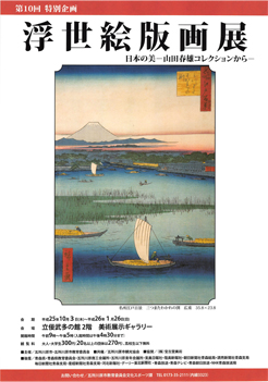 本展は同市出身で東京在住の山田春雄氏のご厚意により、同市のコレクションの中から選りすぐりの浮世絵版画を展示いたします。豊かな心と創造性に富んだ青少年の健全な育成と地域文化の香りを高めることを目的に開催いたします。つきましては、この機会に世界に誇れる日本の大衆文化である浮世絵に触れていただくことを願い、ご来場をお待ちしております。