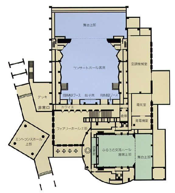 ●用途 : シューボックス型の「コンサートホール」です。ホールは多目的機能をもたせ残響可変装置等の設備をし、舞踊、式典等のイベントに対応でき、広い舞台を有したホールです。またオーケストラピットを舞台の高さまで迫りあげ、舞台スペースを広げて使用することもできます。
