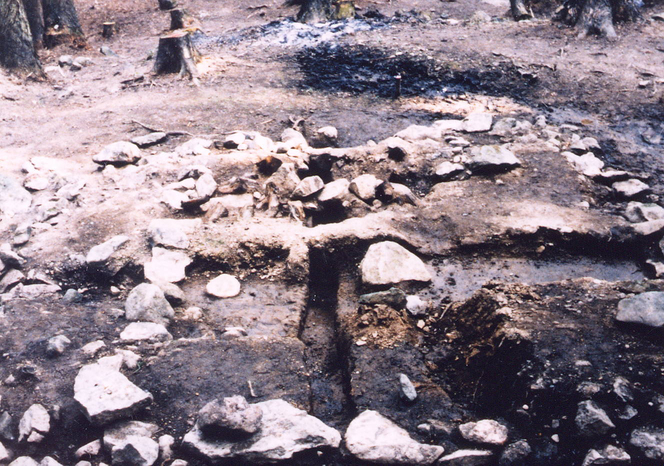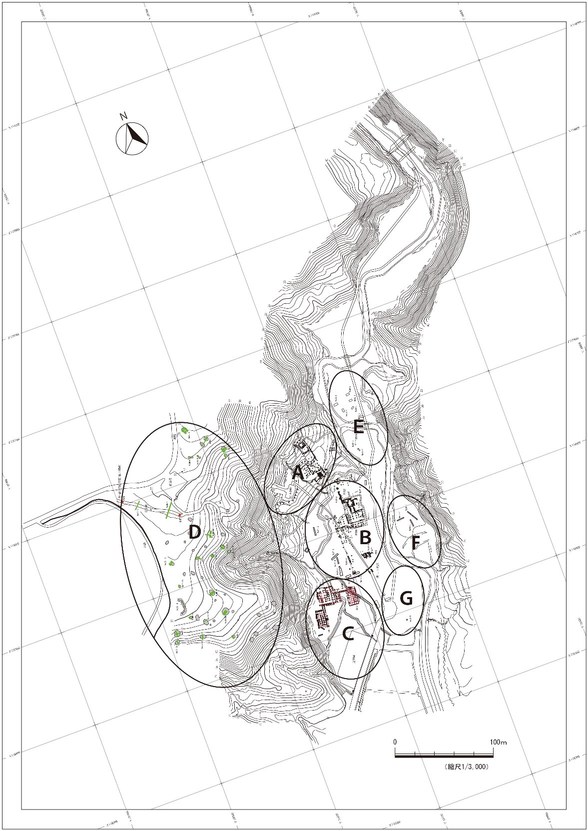 最も奥に当たる丘陵斜面に2つの造成平坦面があります。一番高い平坦面には、一辺6mの方形配石墓(はいせきぼ)をもつ奥院(おくのいん)の存在が明らかとなりました。
