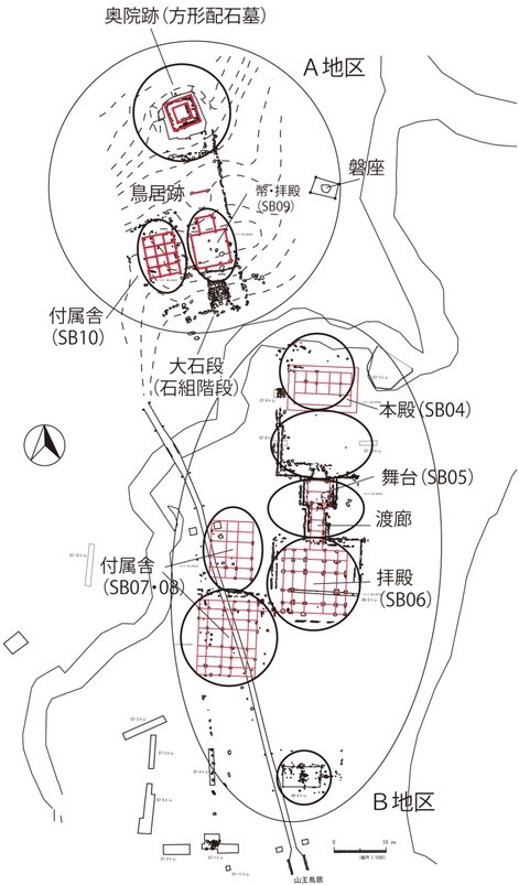 建物配置を復原すると、北から奥院、鳥居、下段の平坦面には幣・拝殿(へい・はいでん)、その下方の緩斜面には石組階段が一直線上に並んで配置されていることが明らかとなりました。
