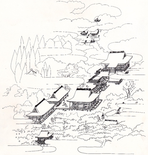日吉神社境内入口の西側平坦地に3棟の礎石建物跡を発見しました。永井康雄氏によれば、最大規模の建物は南側を正面とする入母屋造(いりもやづくり)か寄棟造(よせむねづくり)で、仏堂などの仏教的色彩の強い建物であるといいます。その特徴は東西方向の中央間が最も広いこと、建物の南・東・西面に縁側を設けていること、北側の突出部に仏像を南向きに配置したものと考えられます。そして、最大の特徴は流水を跨いで建築されていることであり、流水の先には庭園の存在が想定されます。さらに、屋根は板葺き或いは草葺きと考えられ、庭園を意識している点などは住宅建築にみられる特徴です。