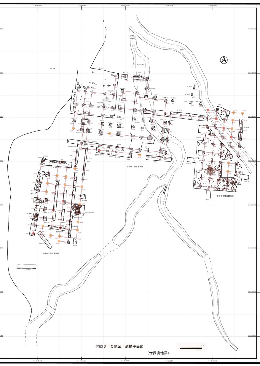 山王坊川西岸の最も開けた平坦地にあたります。建物配置を復原すると、南から拝殿(はいでん)、渡廊(わたりろう)、舞台(ぶたい)・中門(ちゅうもん)・瑞垣(みずがき)・本殿(ほんでん)が一直線に並ぶ社殿列跡が発見されました。さらに拝殿の西側には南北に連なる2棟の礎石建物跡も発見されています。