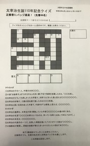 「クイズの正解者には、太宰治の缶バッジを進呈します。(先着44名)クイズのチャレンジは、おひとり1回のみです。」...