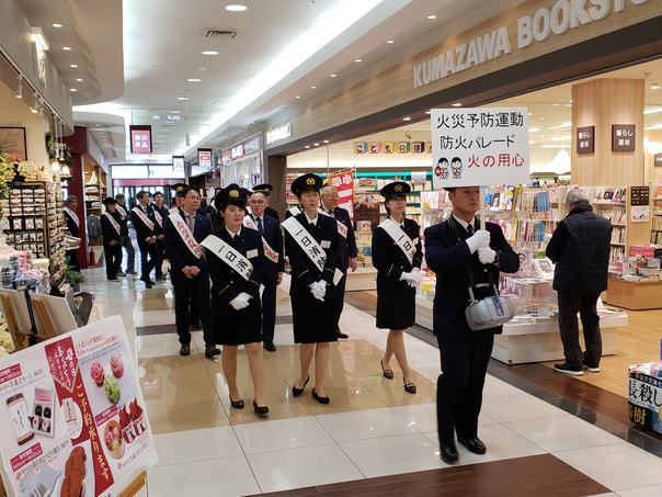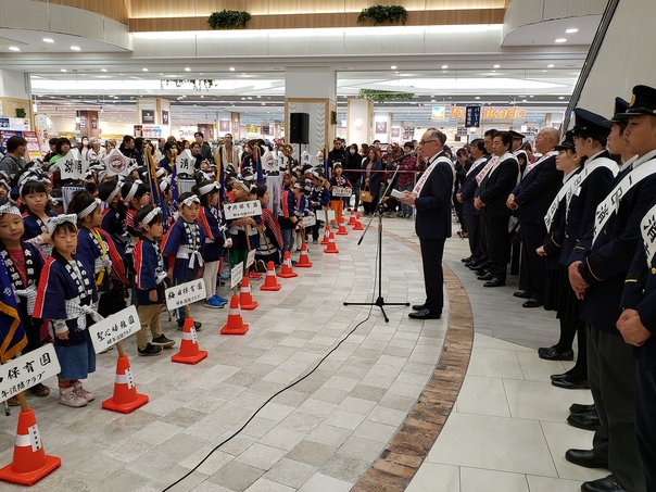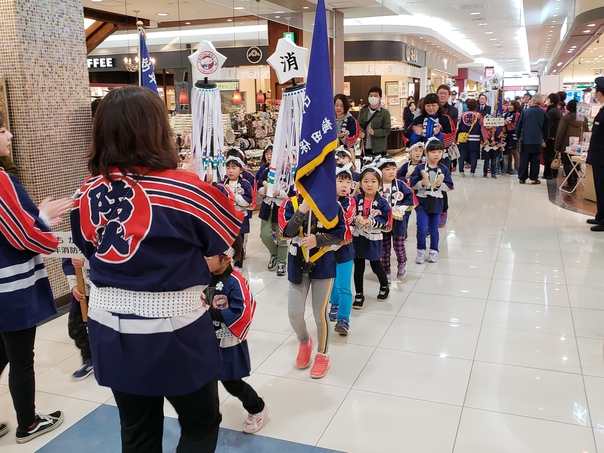 パレードでは、一日消防官3名のほか、幼年消防クラブの皆さんなどが買物客らに火の用心を元気に呼びかけました。