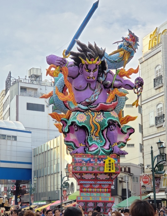 当日は、台風の影響が心配されたものの、晴れ空が広がり、多くのお客さんに中型立佞武多「不動明王」の勇姿と、力強いお囃子を披露することができました。