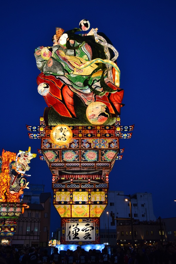 新作大型立佞武多「かぐや」の艶やか(あでやか)で、麗しく(うるわしく)もあり、儚げ(はかなげ)な表情、2年振りの参加となる吉幾三さんの心に染みる歌声、そして親子参加のたくさんの子どもたちをはじめ、参加者と沿道の皆さんが一つになり、祭りは大いに盛り上がりました。