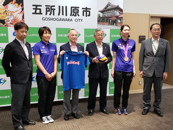 当市では、バレーボールを中心としたスポーツ交流活動を通じ、スポーツ振興と地域活性化を図るため、石川県に本拠地を置くバレーボールVリーグ女子1部チーム「PFUブルーキャッツ」の活動を支援することとし、8月5日、藤田徹部長、江畑幸子選手、堀口あやか選手をお迎えし、チームに支援書を交付しました。