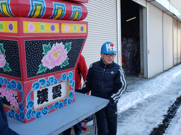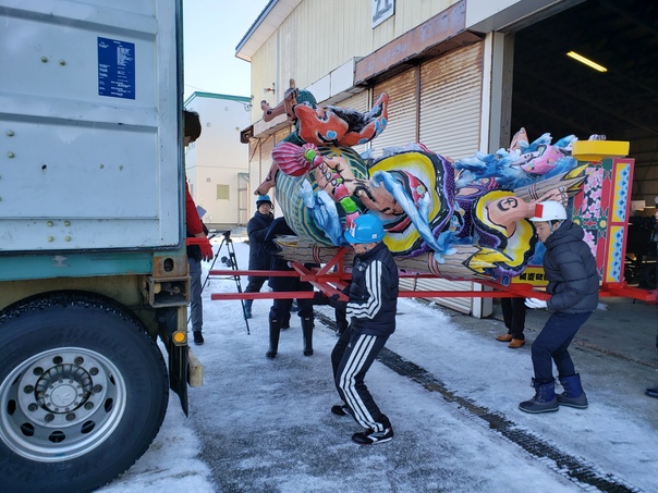 五所川原の魅力をぎゅっと詰め込む当物産展には、りんごをはじめとする特産品のほか、立佞武多も展示することとしており、12月9日に高さ4.6メートルの小型立佞武多「津軽十三浦伝説・白髭水(しらひげみず)と夫婦梵鐘(めおとぼんしょう)」を台湾に向け、搬出しました。